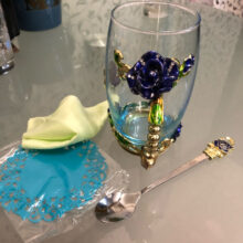 The girl of 20 years was delighted with the mug. I, a person of 40 years, treated calmly)) Gypsy gilding. But made relatively high quality. Everything is glued and painted. Even a butterfly from the inside. On the cup holder you can see traces of the molding (?). Spoon flat. Metal, but light. A small turquoise napkin is silicone. Very, very long shipping. Despite being paid. The store on the contact goes)) good, and he also suggested that local delivery slows down.